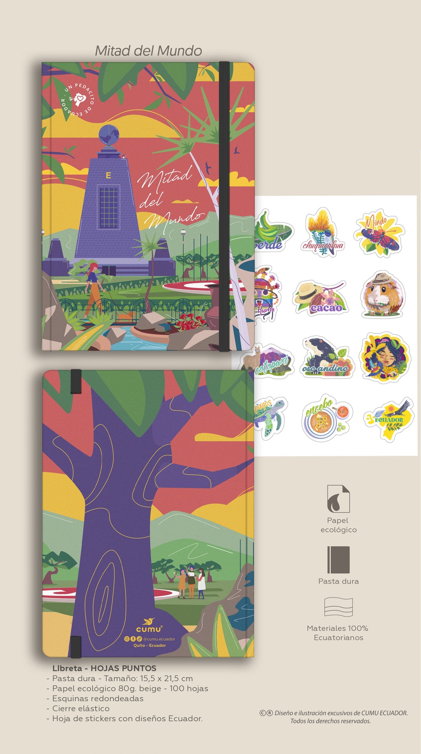 Lleva contigo la esencia del Ecuador con la Libreta "Mitad del Mundo" de Cumu, un tributo al icónico monumento que marca la línea ecuatorial. Su diseño vibrante y lleno de color es ideal para quienes aman la cultura, la historia y la creatividad. Perfecta para escribir, dibujar o planificar tus días mientras conectas con la magia de estar en el centro del mundo.